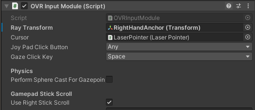 - In EventSystem -> OVR Input Module(Script) Drag RightHandAnchor in Ray Transform field